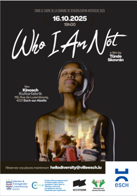 16/10/2025 (Do. 19h) Ciné-débat in Esch/Alzette „Who I am not“ (Kinosch). Après la projection, un échange informel avec Dr Erik Schneider de l’association Intersex & Transgender Luxembourg et Ursula Rosen avec le public permettra d’approfondir les thèmes abordés. Cet échange se tiendra en allemand. Si vous souhaitez bénéficier d’une traduction en français ou en anglais, nous vous remercions de nous en informer lors de votre inscription à l’adresse : hellodiversity@villeesch.lu