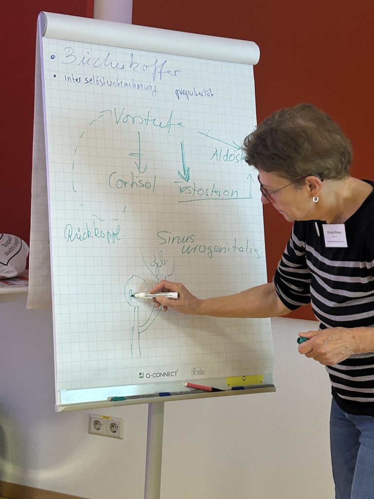In dieser Veranstaltung geht es darum, die Notwendigkeit endokrinologischer und chirurgischer Vorgehensweisen bei AGS darzulegen und zu diskutieren. Diese basieren auf medizinischen Vorstellungen von weiblichen Körpern. Hierbei geht es nicht nur um oftmals als unbedingt zu vermeiden betrachtete „Schreckensfälle“ mit klinischen Diagnosen wie Sinus urogenitalis und Prader V, sondern um alle Kinder, auch die, die relativ unauffällig als Mädchen durchgehen. Dabei gilt zu bedenken, dass bestimmte als problematisch erlebte Situationen teils erst mit Eintritt der Pubertät auftreten, wie z.B. beim Sinus urogenitalis, wenn bei Einsetzen der Menstruation das Blut durch die Harnröhre abfließen muss. In einem anderen Fall, z.B. bei einer großen Klitoris, sind keine körperlichen Gesundheitsstörungen zu erwarten. Entscheidend hierbei ist der autonome Wunsch des Kindes nach operativer Anpassung, basierend auf einer informierten Einwilligung.